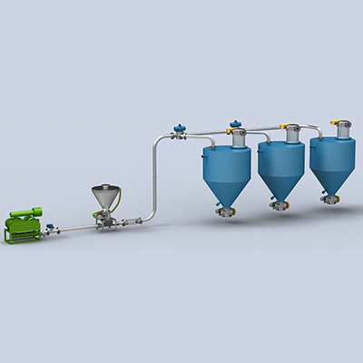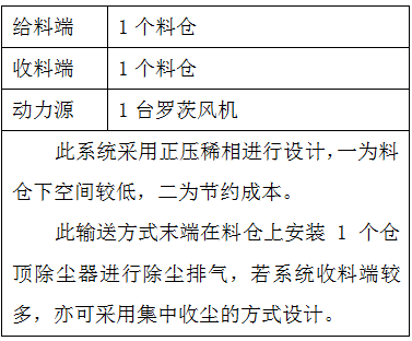 低壓壓送式系統(tǒng),動力源多采用羅茨風機,設在系統(tǒng)的進料端。物料與空氣混合加速后被壓送至末端的收料設備或緩存?zhèn)}內,而壓送的空氣則經過倉頂除塵器凈化后排入大氣。